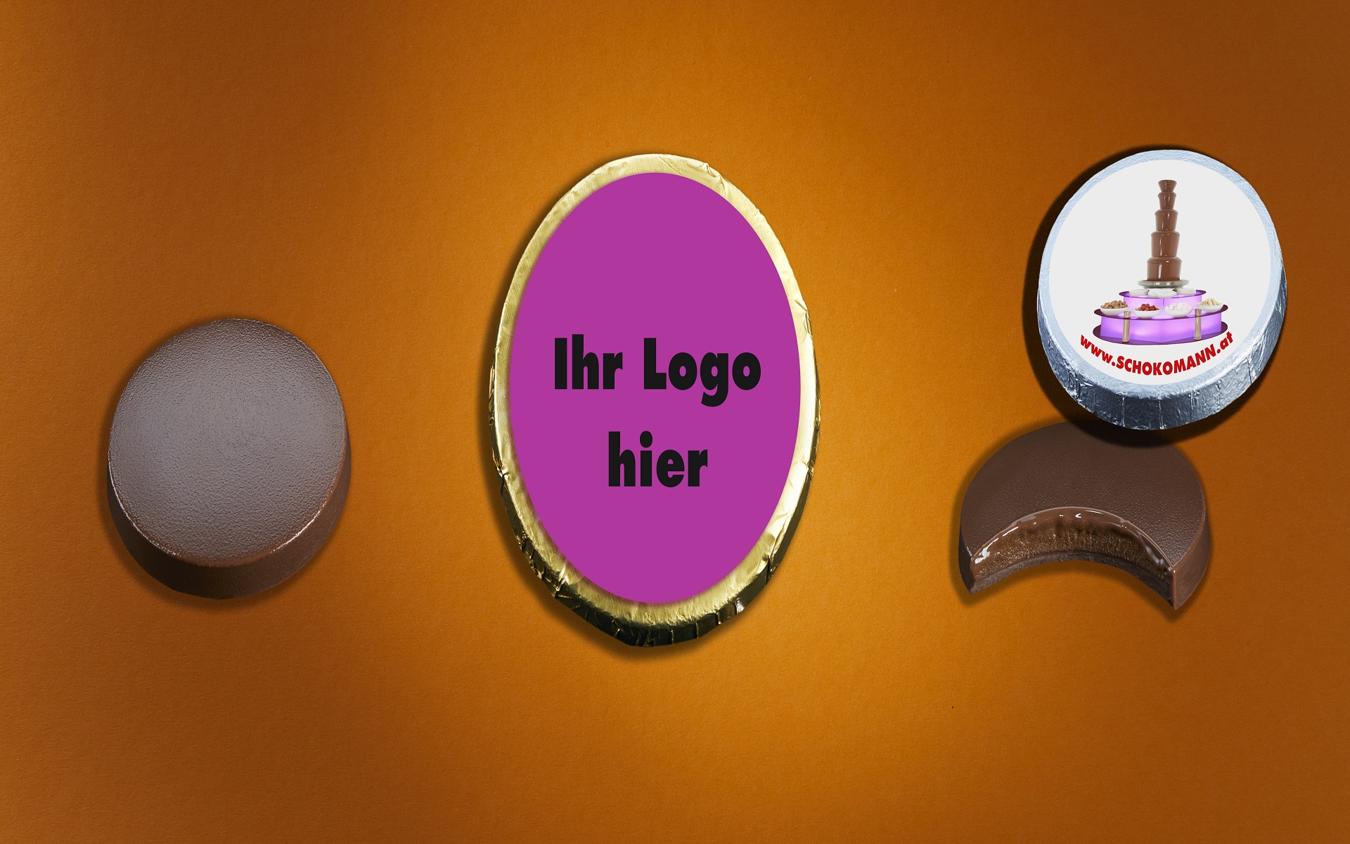 5 cm große und 20 g schwere SchokoladenSpezialität in Goldfolie gewickelt – versehen mit individuellem Etikett.