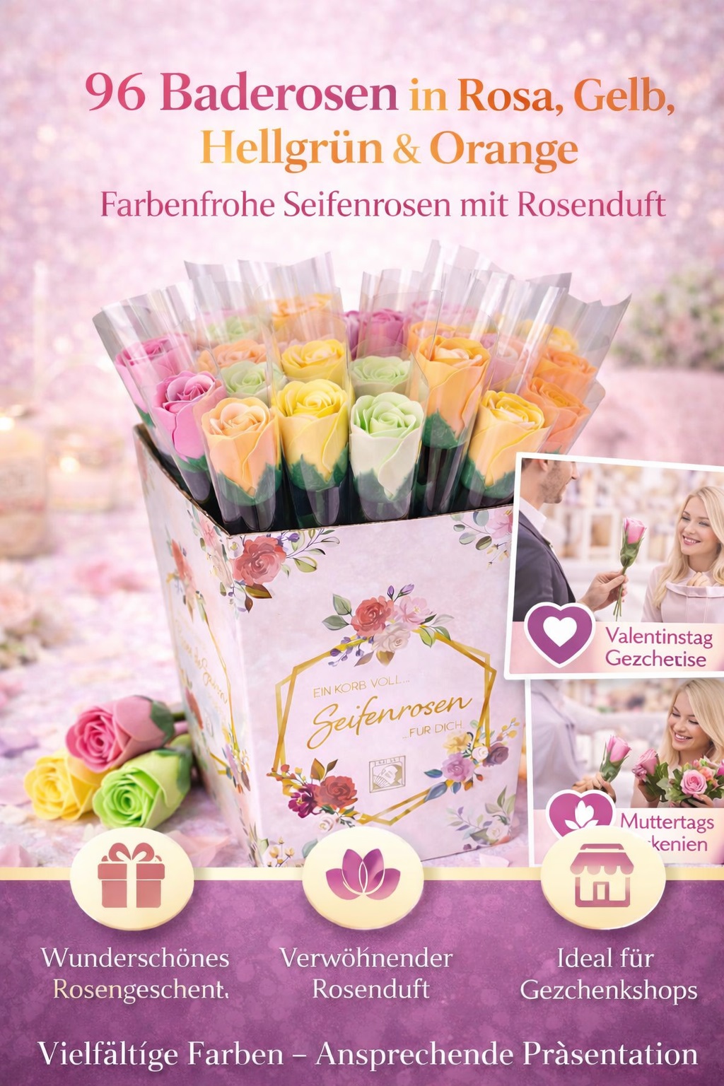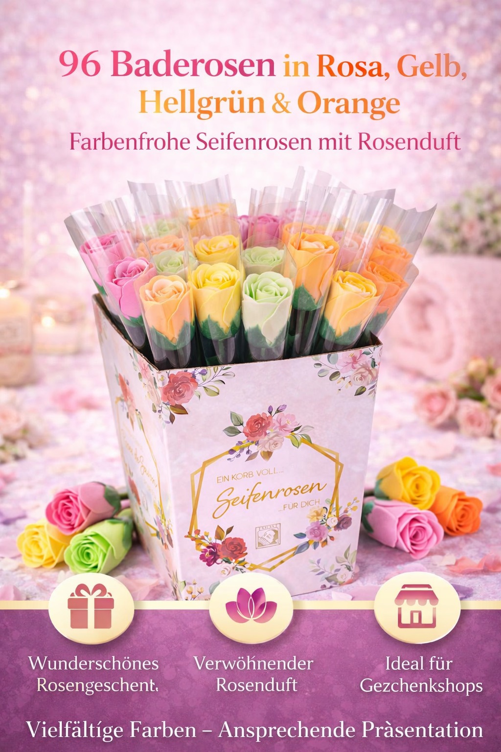 Dank der dekorativen Displaybox (VE 24) eignen sich die Baderosen hervorragend für den Einzelverkauf, Geschenksets, Wellnesshotels und saisonale Aktionen – besonders rund um den Muttertag.